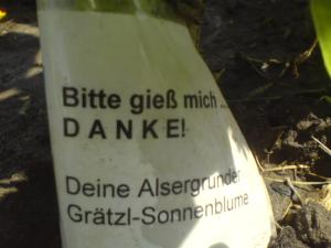 The sign says: Please water me. THANK YOU! Your Alsergrund “Grätzl*”-Sunflower.