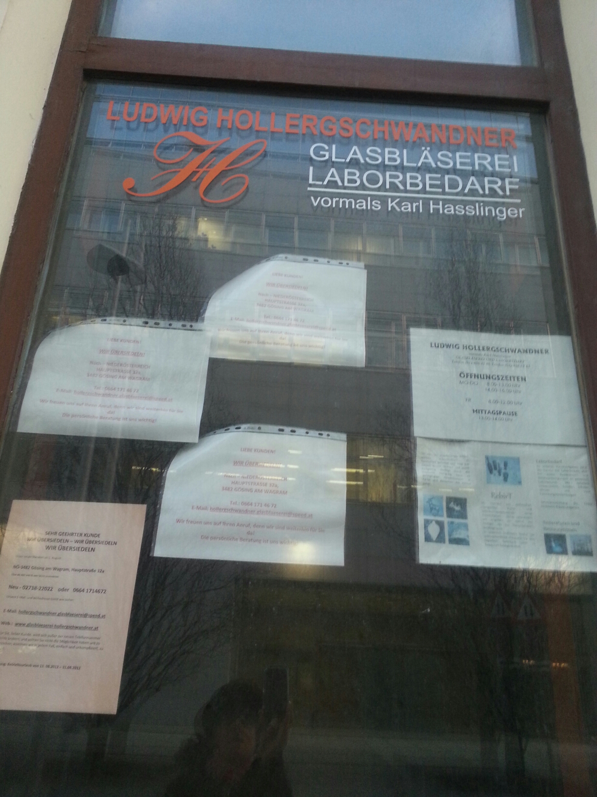 19 JanThis window says something about what is changing in Vienna. First of all, this highly specialized medical glass business has moved out of town, away from the medical district into Lower Austria. They didn’t bother to remove their opening hours before leaving, though, and so we can see that they still upheld the convention of closing for one hour in the middle of the day for lunch.