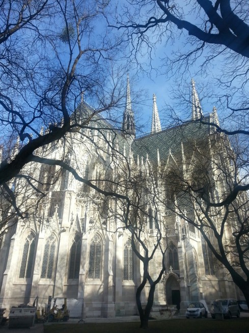 This was taken at the Votivkirche this afternoon, after which I met a colleague at the Naschmarkt where we sat outside (under heaters, granted) and drank wine, ate cheese, and caught up on six months or so of life. Really something at the end of February
