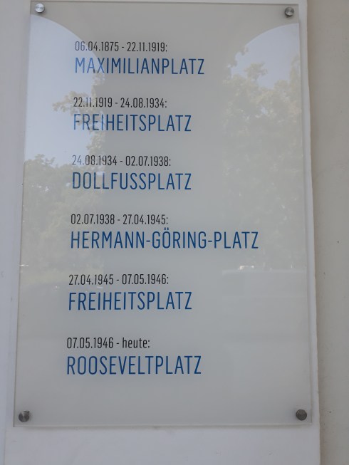 I can guess at most (all) of them. Maximilian was Emperor Franz Josef’s brother, who had the nearby Votiv Church built. Freiheitsplatz (Freedom Square) probably expresses the hopes of the new democracy after the First World War. Dollfuss was the Austrian chancellor assassinated by National Socialists in July 1934. Hermann-Göring-Platz is sadly self-explanatory. And then Freiheitsplatz again until it was named after the U.S. President Roosevelt.