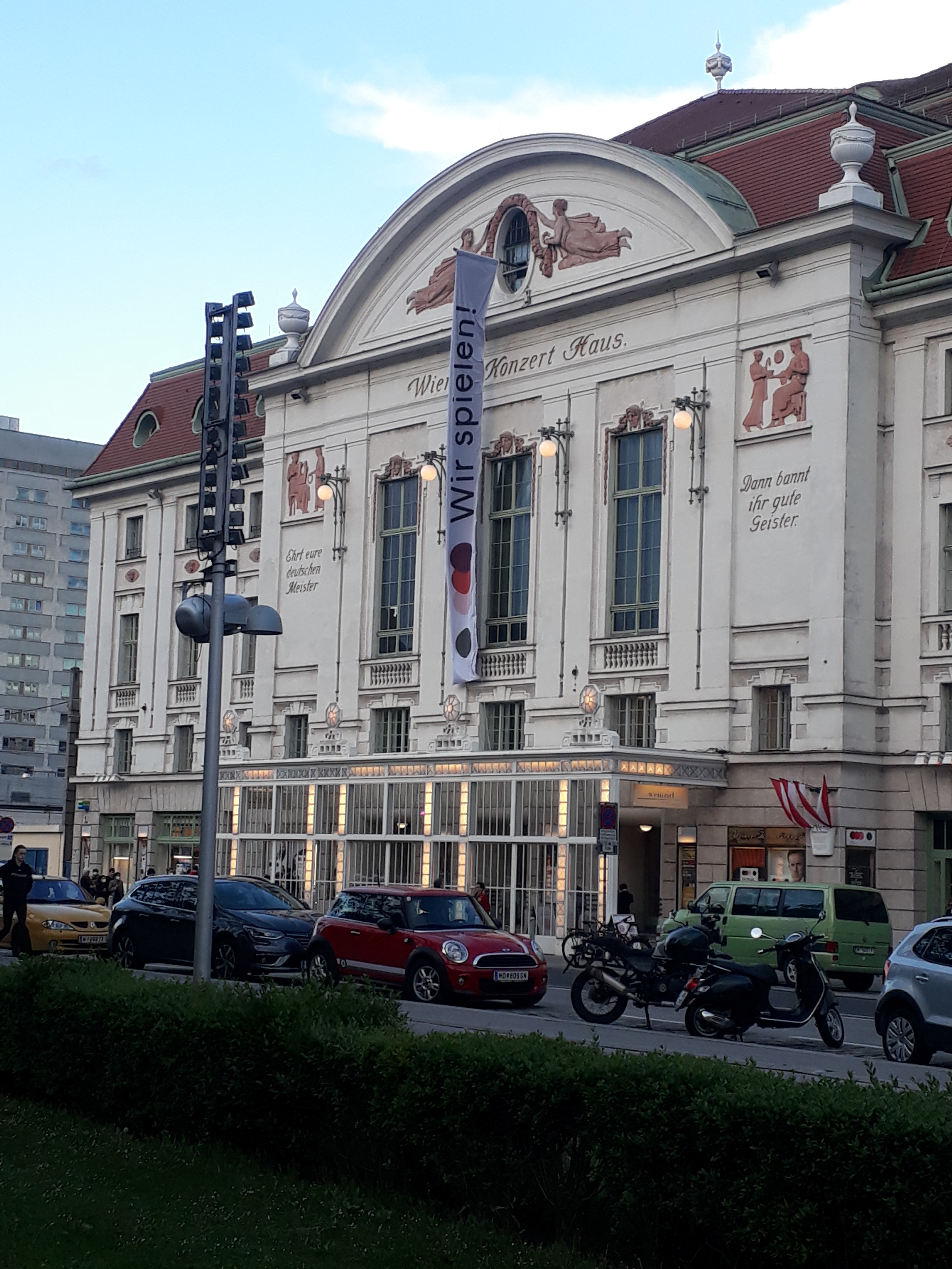 The photo above shows the front of the Konzerthaus this evening, adorned with a flag that brought tears to my eyes with its jaunty text: Wir spielen! (Love the exclamation mark.) Literally that would be “We’re playing!” and essentially it means we are back in business. 🙂