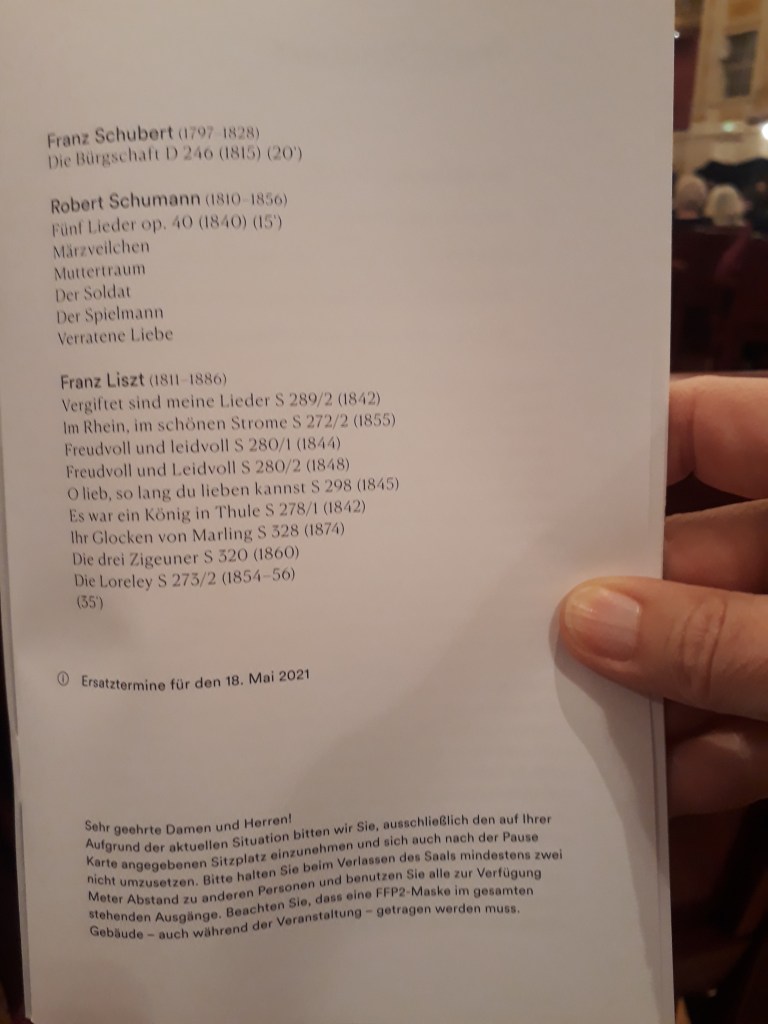 A note in the program (below) and announced before the start of the concert laid out the rules for “the current situation”: no intermission, to only sit in your assigned seat, when leaving the hall to allow 2 meters distance (wasn’t possible even using all the exits as requested!), and the mandatory FFP2 mask at all times, even during the performance. (Friends told me that at Salzburg last summer you were allowed to take off your mask once you reached your seat but had to put it on again before starting the applause. That didn’t turn out so well. The government, however, does seem to be learning.)