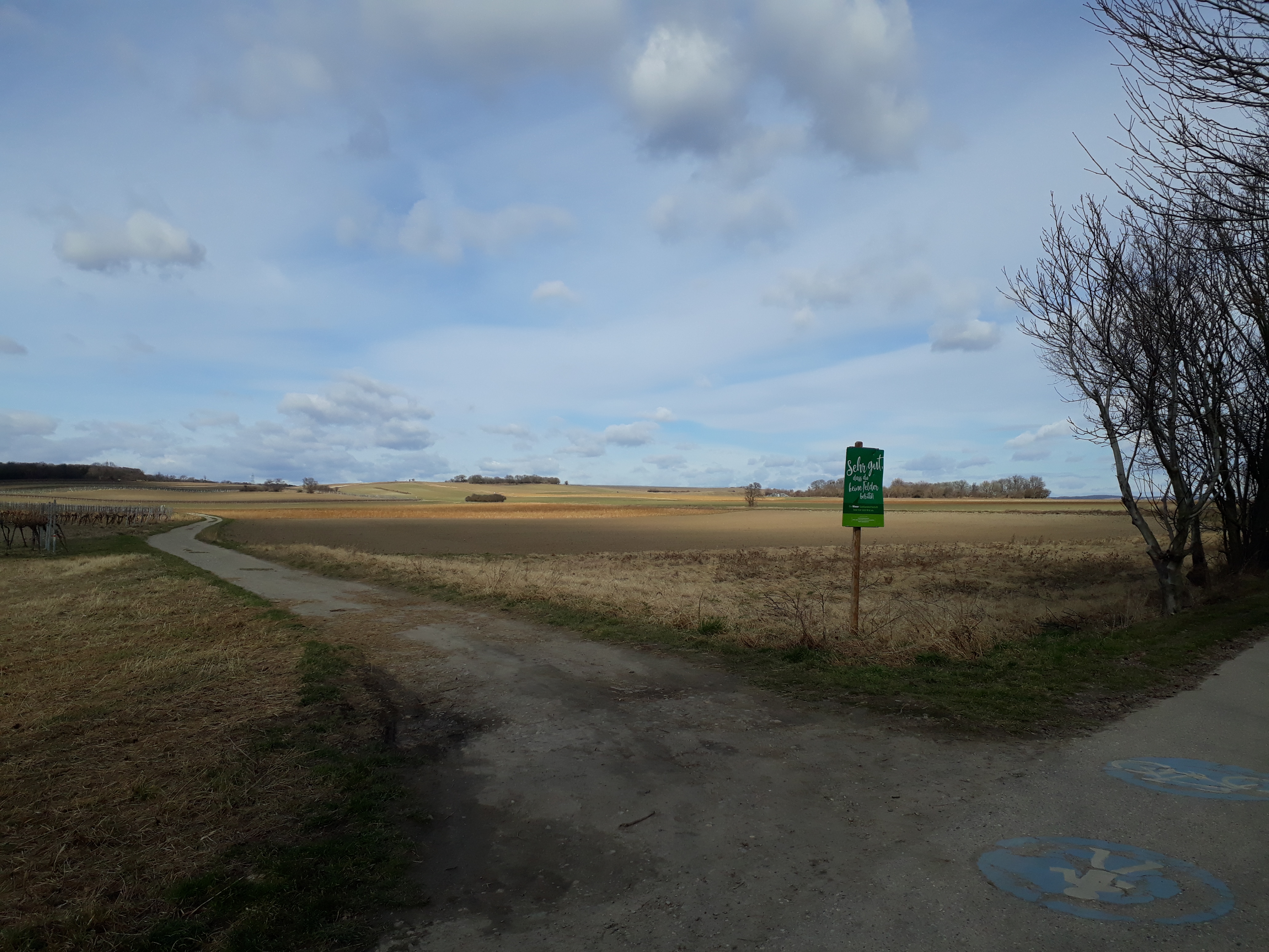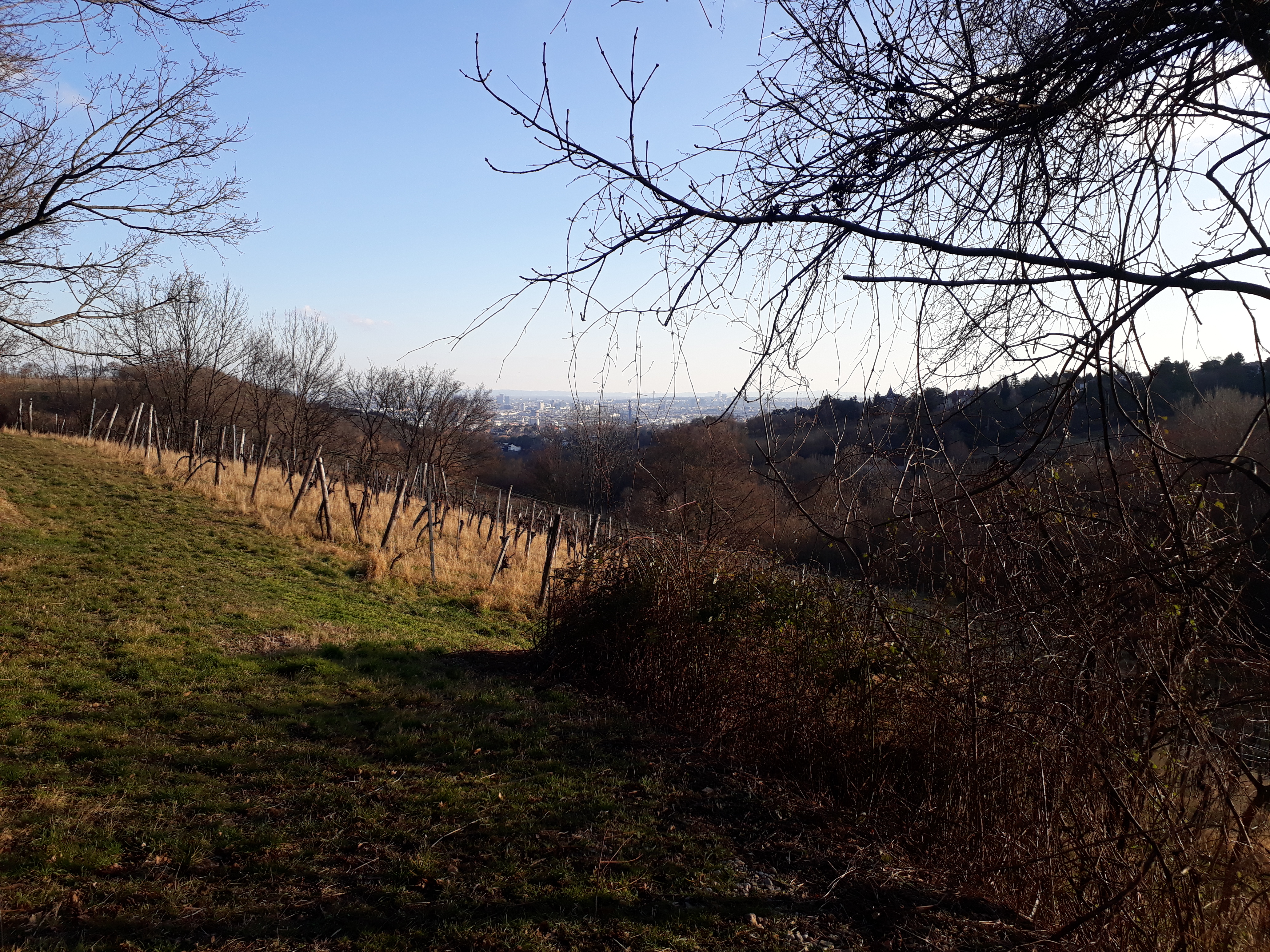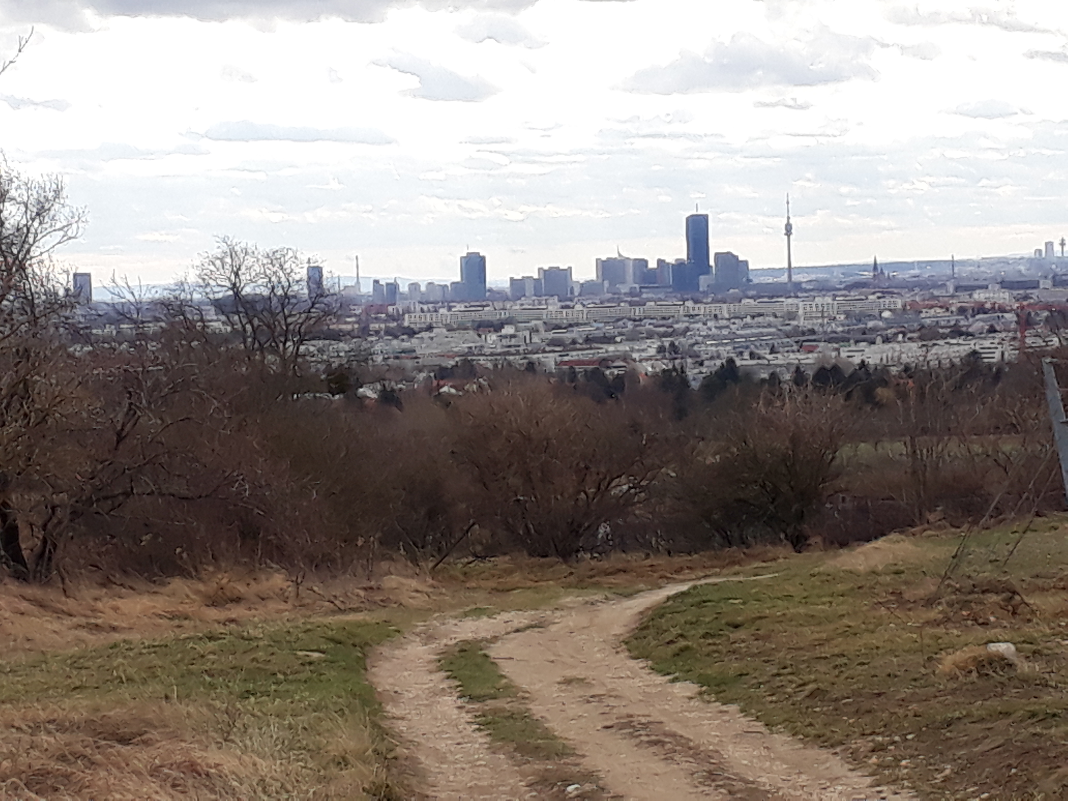 This time we walked through rather bleak vineyards (well, it is still February) and then open fields on the flat, with a view of Vienna on one side and of Lower Austria (not shown) on the other, before climbing up a stretch of Bisamberg and heading back to Hagenbrunn.