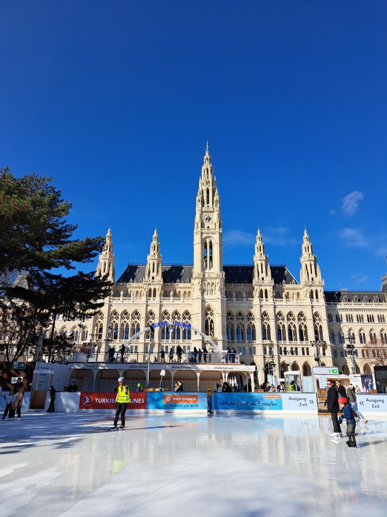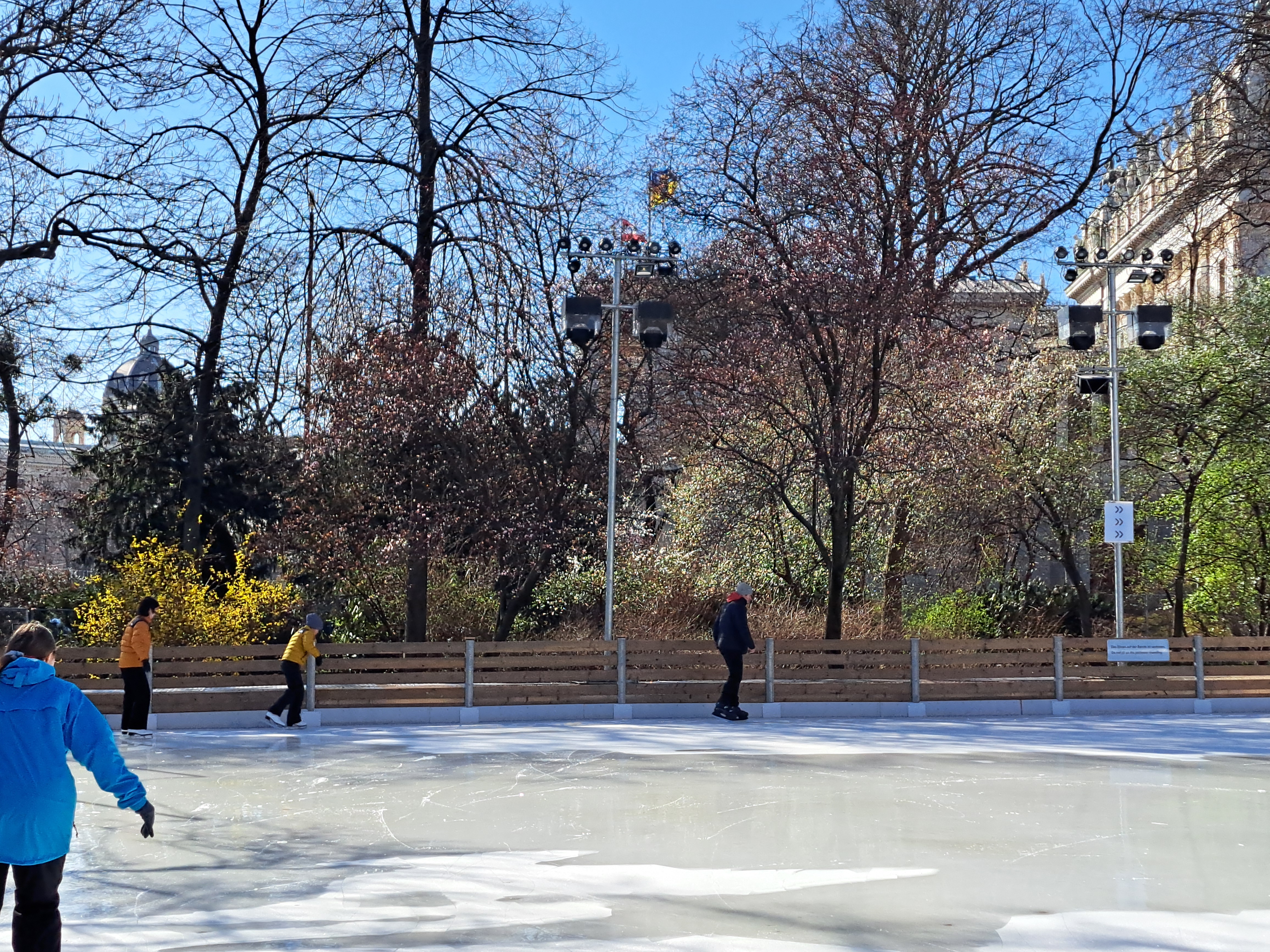 As for today, this is the last day the ice-skating rink in front of the Rathaus is open. (Actually it offers two levels — so probably one of the few places you can skate uphill and then down again — and paths through the park so “rinks,” plural, seems more appropriate.) Given that not only the forsythia is out but also the flowering trees, it is probably a good thing that today is that last day.