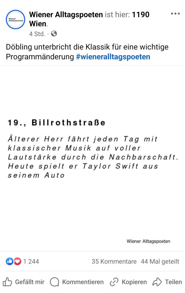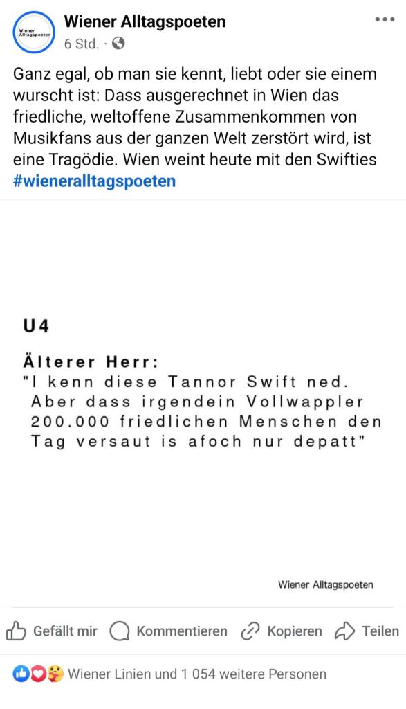 One of my kindest and most faithful readers asked if I had survived the invasion of Swifties. This made me think I should share these posts from the Wiener Alltagspoeten (Vienna’s Everyday Poets).