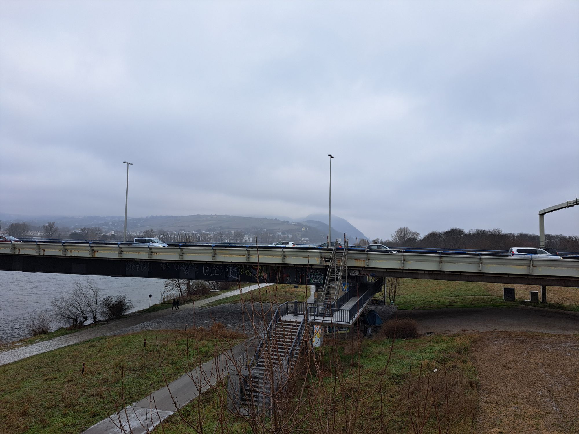 As I mentioned in that post from May 2022, we didn’t manage the whole last stretch in one shot and so just had a couple of kilometers to go this time. We took the 34A bus from Floridsdorf more or less to where we stopped last time and set off from there in the direction of the Danube. Remarkably, given that we had often had trouble with the directions and missing trail signs, we didn’t have to re-trace our steps once. We found the pedestrian overpass that allowed us to cross the Autobahn first try and found ourselves walking along the banks of the Danube where the wind was, if possible, even stronger.