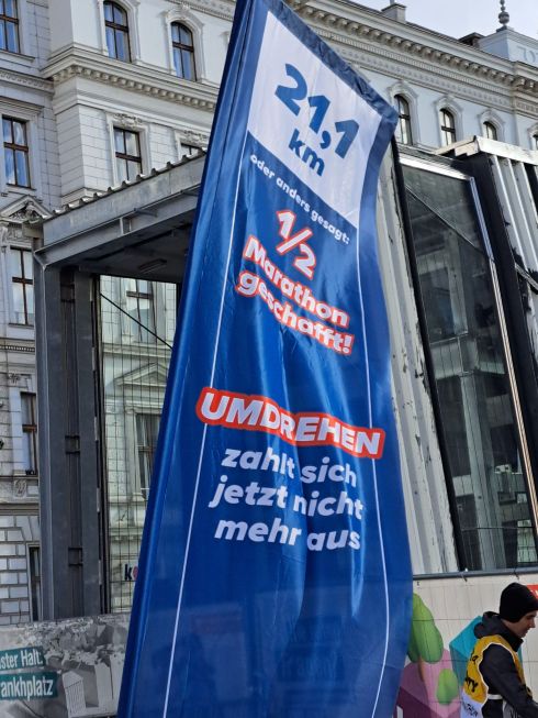 Other kinds of advertising were less disturbing, like the Erste Bank’s #glaubandich (“Believe in yourself”) in huge letters on the asphalt of the Reichs Bridge and the Hervis (sporting goods shop) banner at the halfway mark, telling the runners, who I’m sure had no time to take it in, that it made no sense to turn around now. (Like the old joke of the channel swimmer who got within 50 meters of the other shore and said, “I’m too tired. I can’t,” and turned around to swim back to where she came from.)