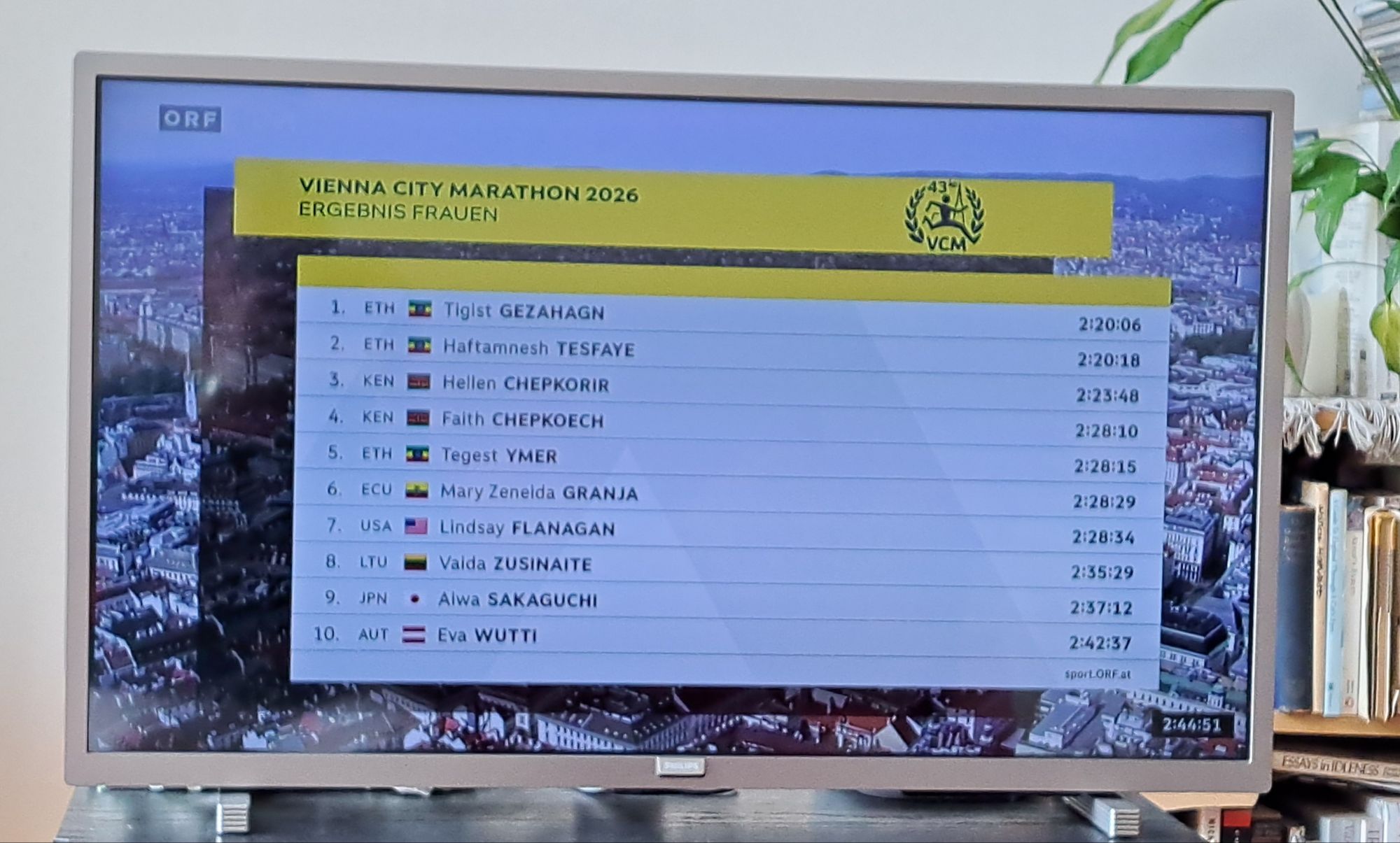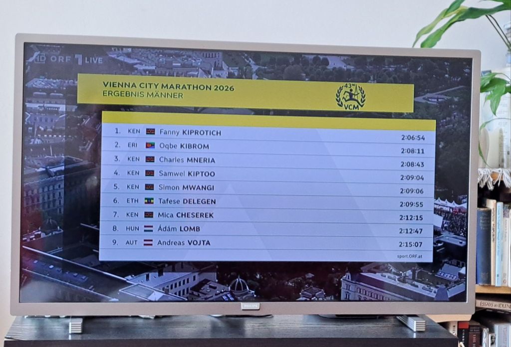 First Austrians were, as you can see, Andreas Vojta and Eva Wutti, the same runners to come in first for Austria in 2025. Both were somewhat disappointed with their performances. Andreas Vojta was hoping for a personal best but did more or less as well as he did last year, both in terms of time and position. Eva Wutti was struggling at times and at one point in the Prater simply stopped, clearly in distress. She later mentioned that she was having muscle problems and that the heat affected her. (In fact, a lot of people talked about the heat. By the end, the ORF was saying that it was 23°C [about 73°F] — my thermometer showed about 18° [64°F] but OK. In any case, it was well over the 8° to 9°C that they last year, when it was barely above freezing, said are ideal.)