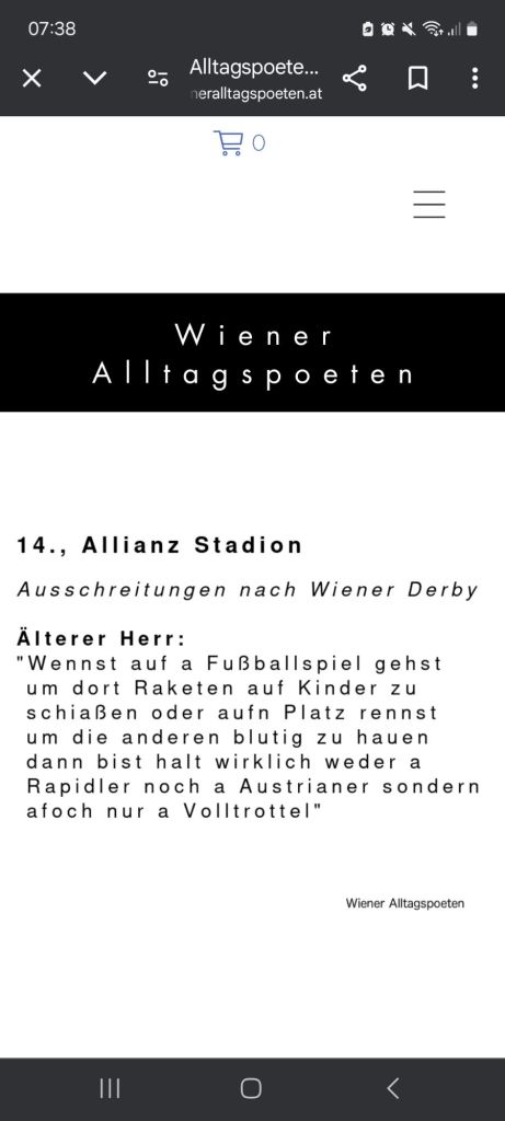 I did want to put in what the Viennese everyday poet said (photo below), sadly in a very dull translation that doesn’t catch the Viennese tone: When you go to a football match to shoot fireworks at children and to run onto the pitch to pound other people bloody, you’re neither a Rapid fan nor an Austria fan, you’re really just a total idiot.” (Which is putting it mildly if you ask me.)