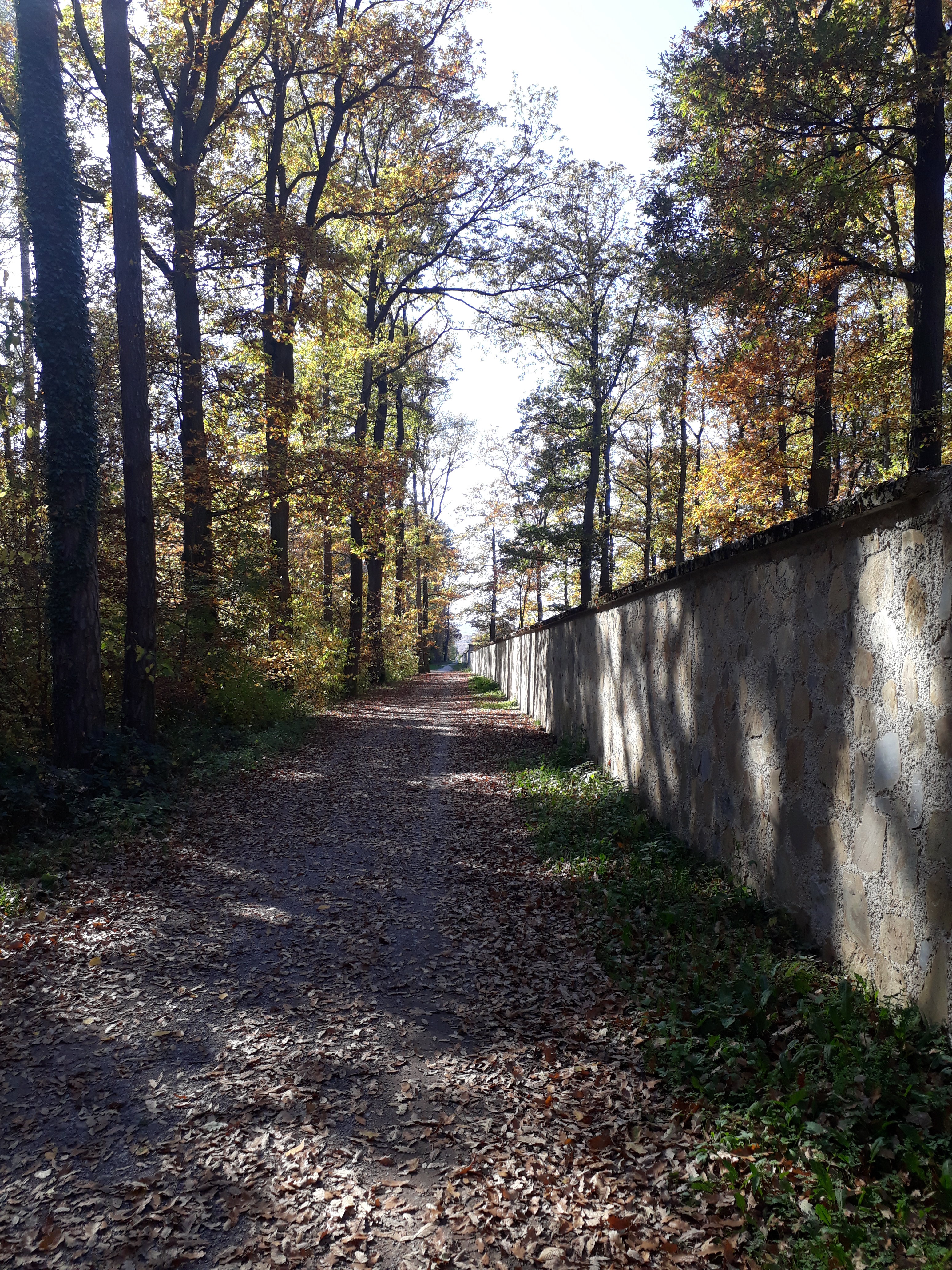 Then we followed the path along the wall of the Lainzer Tiergarten until we turned off to the left in the direction of Mauer. It was an exquisite walk through an autumn woods at its peak, with just the occasional flurry of bright leaves blown from the trees.