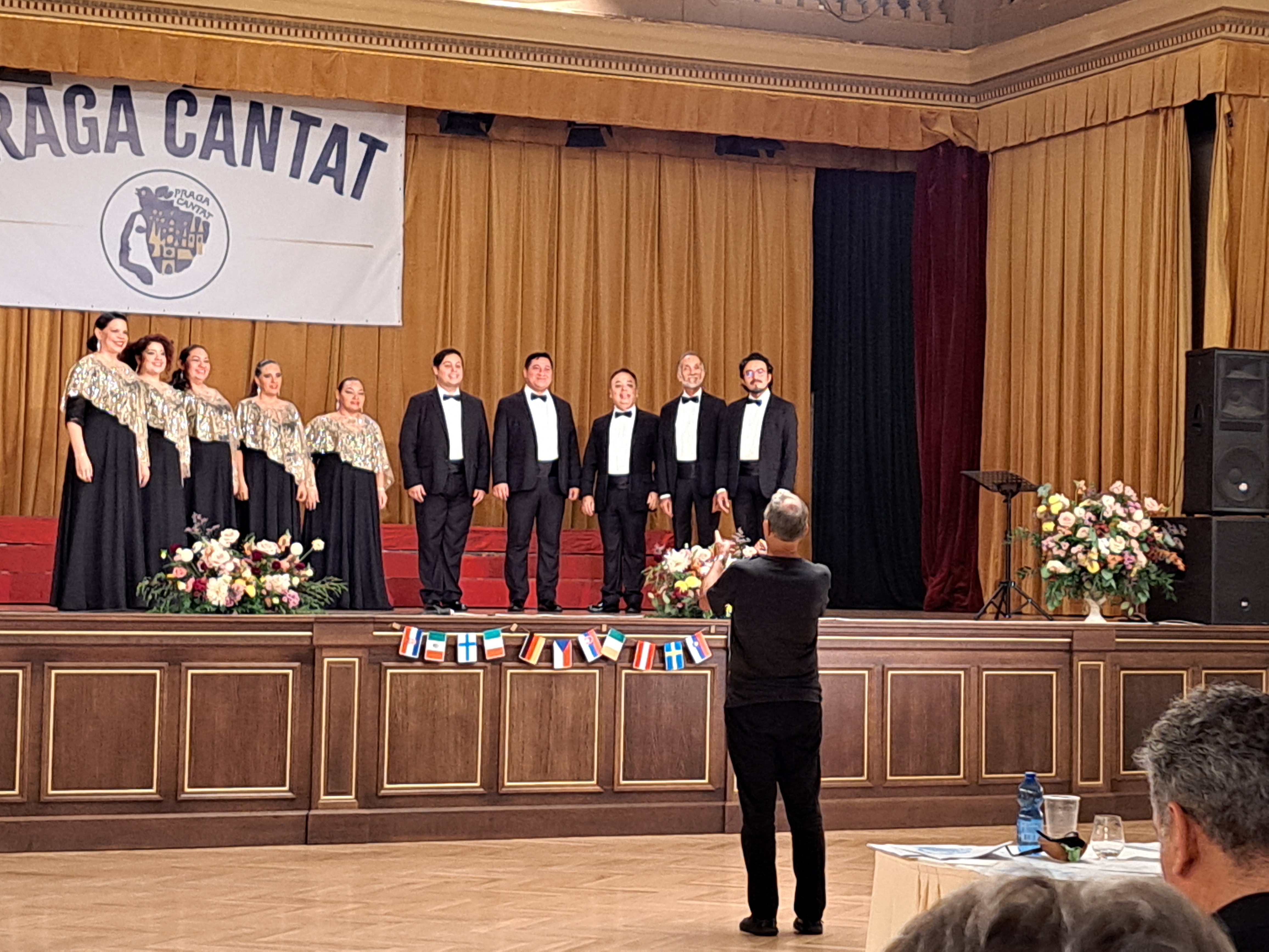 The other thing that made it more of a festival than a competition was a ritual I found moving. There were three categories where the choirs were given a mandatory piece to learn. When the prizes had been awarded in those categories, all choirs in the category were asked to come up and sing the required piece together – conducted, I think, by the conductor whose group had won. For the Coro, this meant that their conductor, a native Spanish speaker originally from Venezuela, ended up conducting the Dvorak piece – in Czech in the capital of the Czech Republic – that was the required piece for the mixed choruses. (He was already completely overwhelmed because of the two special prizes that went to the Coro one was for the interpretation of that Dvorak piece!)