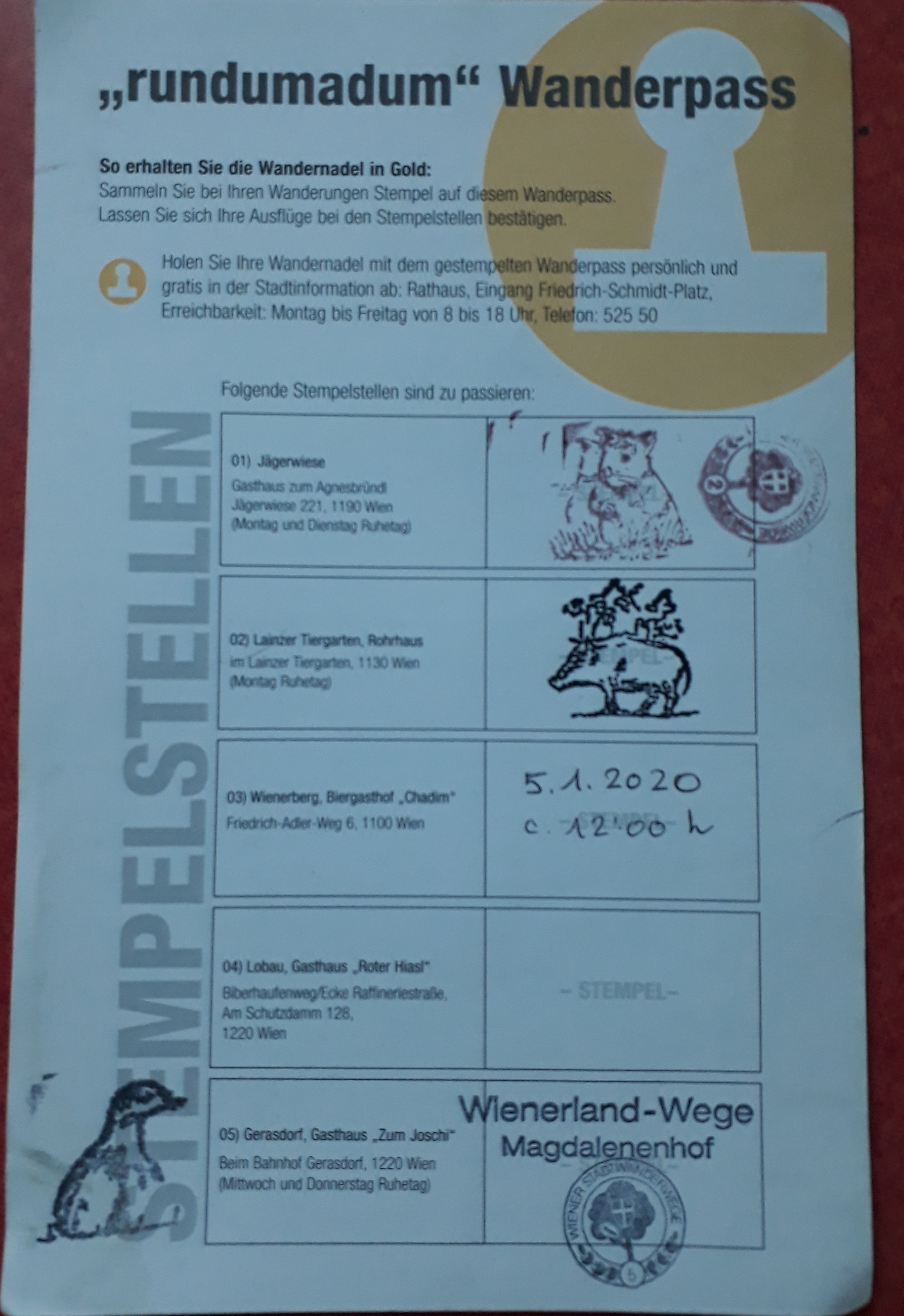 We are nearing the end of the Rundumadum. In fact, because I started with the last leg of the trail, I have now come full circle. I do still need to get the stamp from the Roter Hiasl restaurant in the Lobau as they were not open when we passed that way. Then I will be eligible for my City of Vienna hiking pin. 🙂